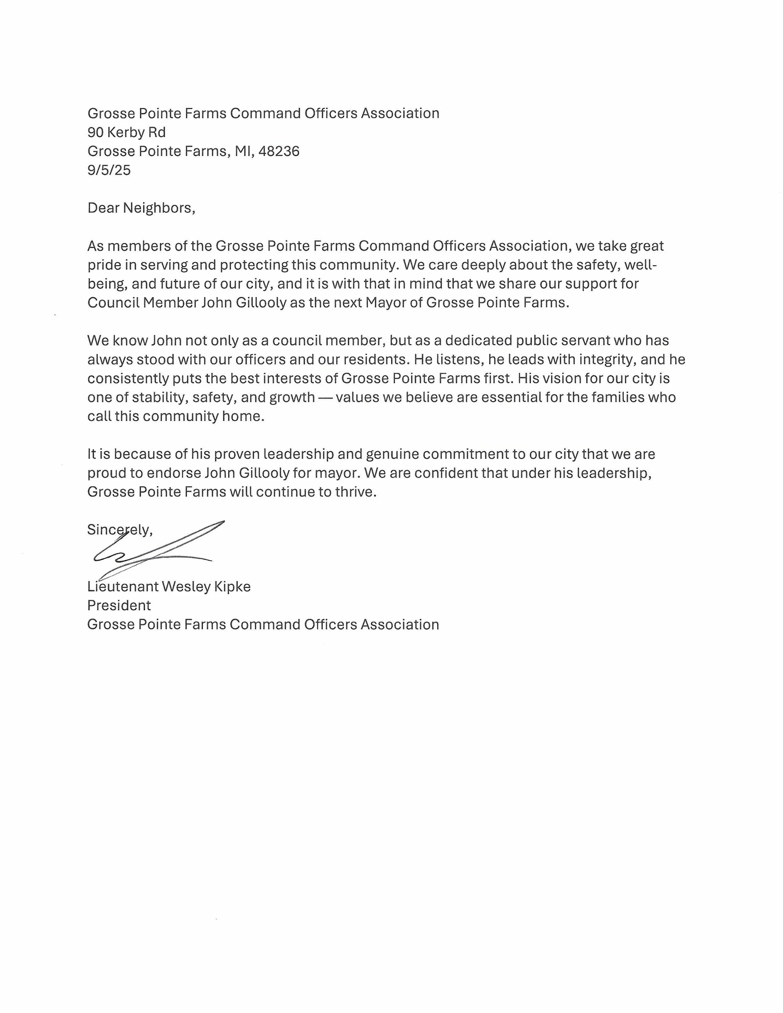 “One of the things I value most about serving on the Grosse Pointe Farms City Council is that we listen to our residents, respect one another’s perspectives, and stay focused on what’s best for all members of our community—not our own egos. John Gillooly embodies that spirit of service, and I’m proud to support him as our next Mayor.”